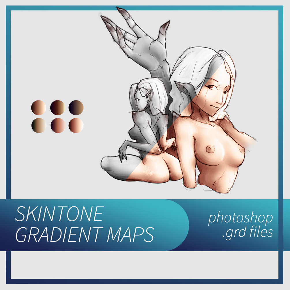 These 6 gradient maps are used to quickly apply a natural base of color for the skin over a greyscale painting. Since usual color layers lose saturation when put on greyscale, these gradients are calibrated to work and apply good amounts of saturation for skintones from light to dark